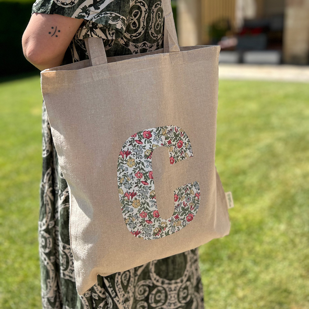 Bolsa de tela tipo Tote con medidas de 42 x 37 cm y asas de 30 cm personalizada con una inicial