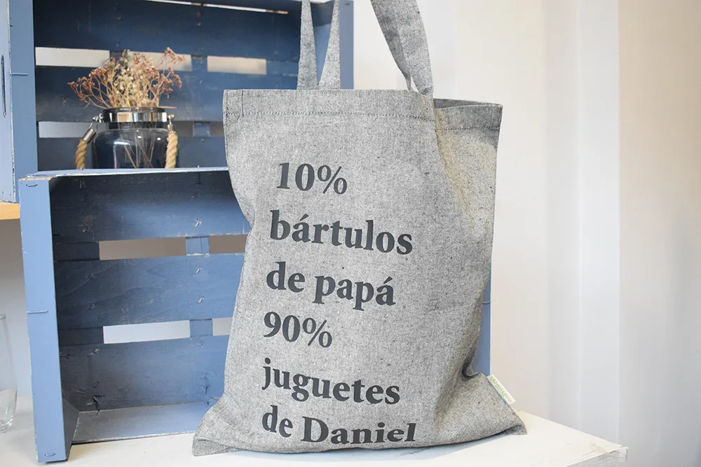 Bolsa de tela tipo Tote con medidas de 42 x 37 cm y asas de 30 cm con el siguiente texto: «10% bártulos de papá, 90% juguetes de…» personalizable con el nombre del niño o la niña