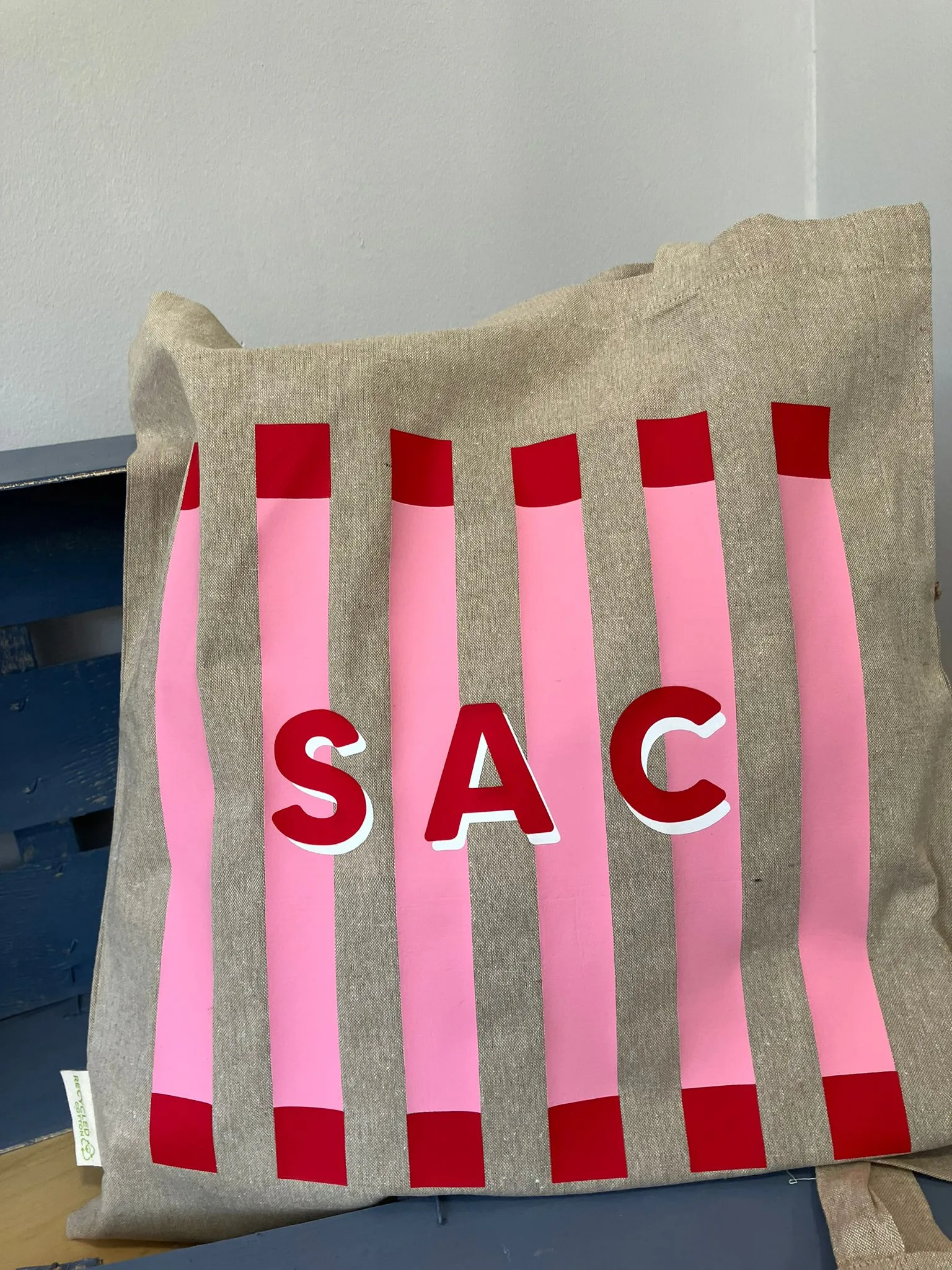 Bolsa de tela tipo Tote Rayas Rojo con medidas de 42 x 37 cm y asas de 30 cm personalizada con tres iniciales