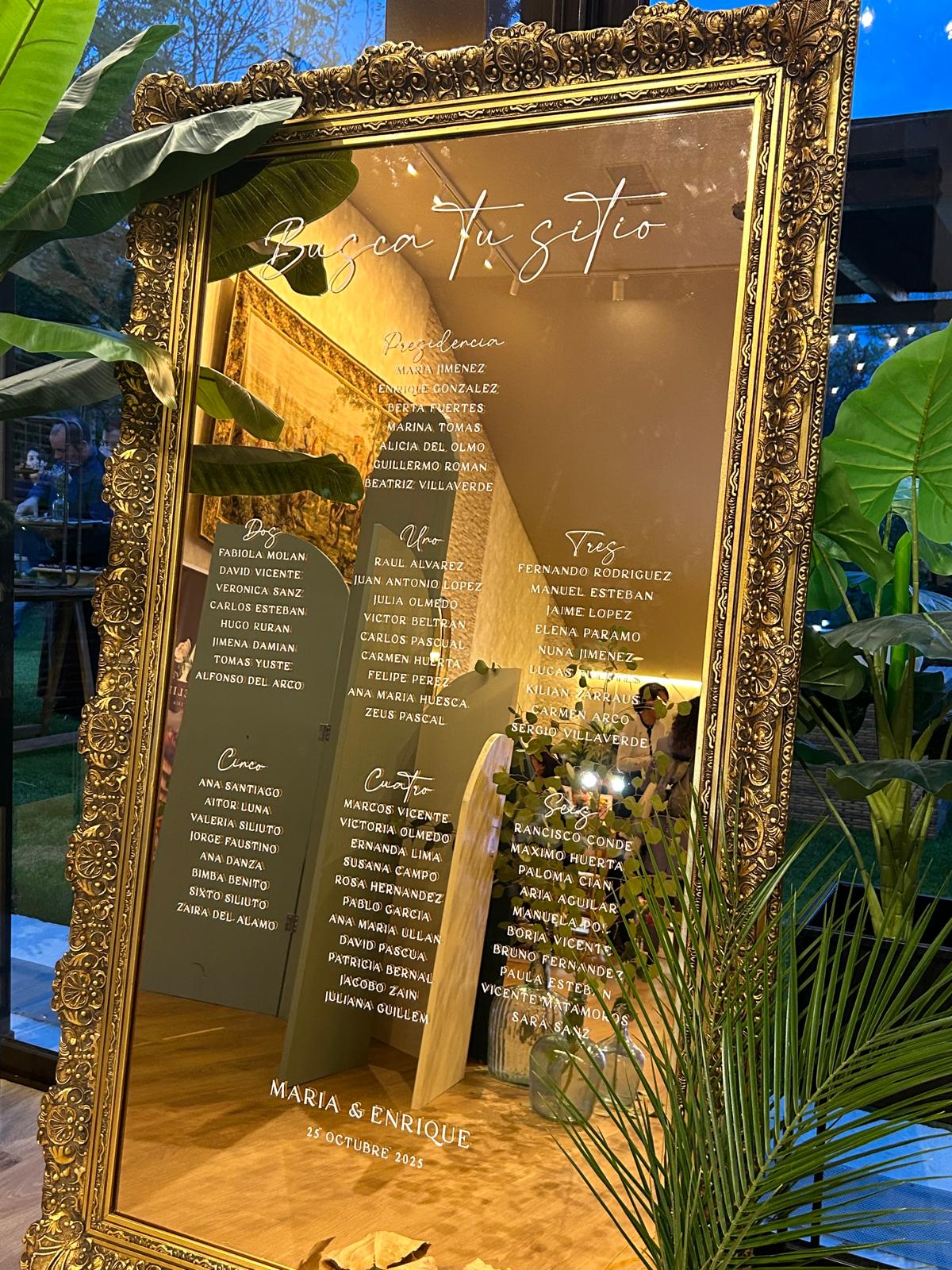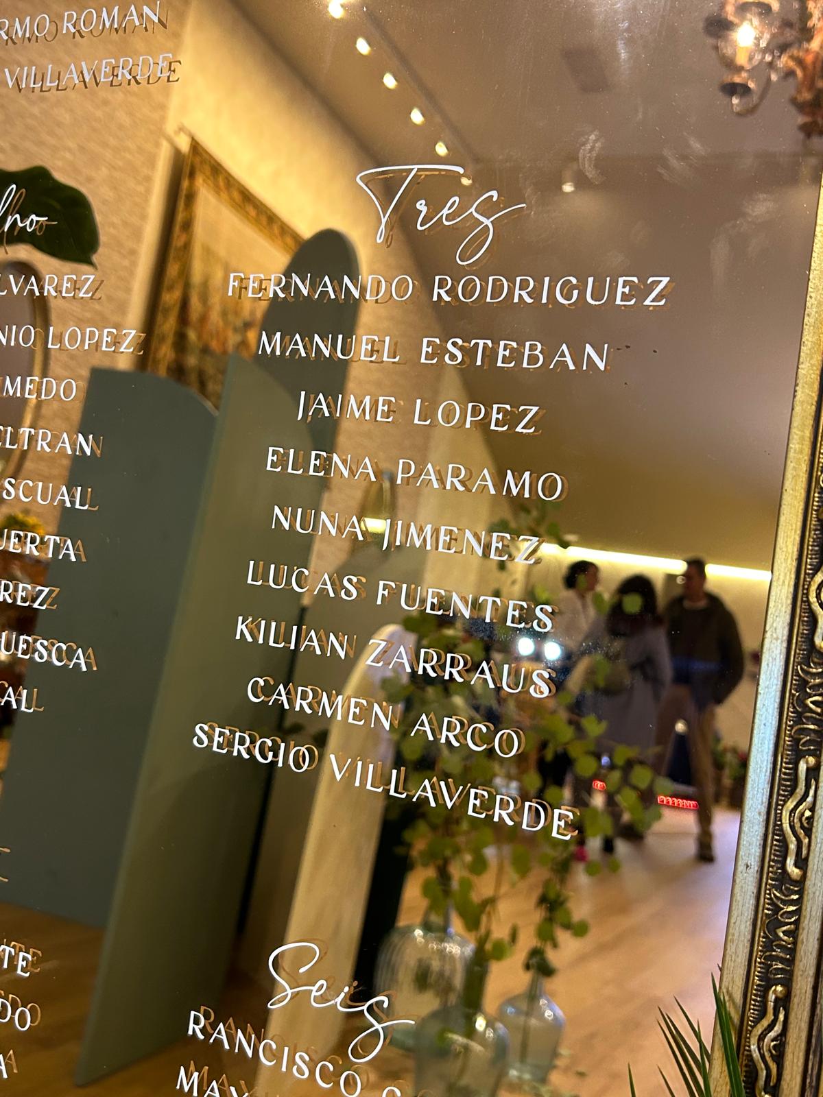 El cartel seating vinilo espejo es la opción perfecta si quieres darle un toque más especial a la decoración de tu boda. Para que sea mucho más personal, te damos la opción de personalizarlo con vuestros nombres, fecha y una frase. Además, si quieres poner un texto diferente, ¡no hay problema! Dínoslo y lo personalizamos con la frase que nos digas. Los vinilos son tendencia este año.
