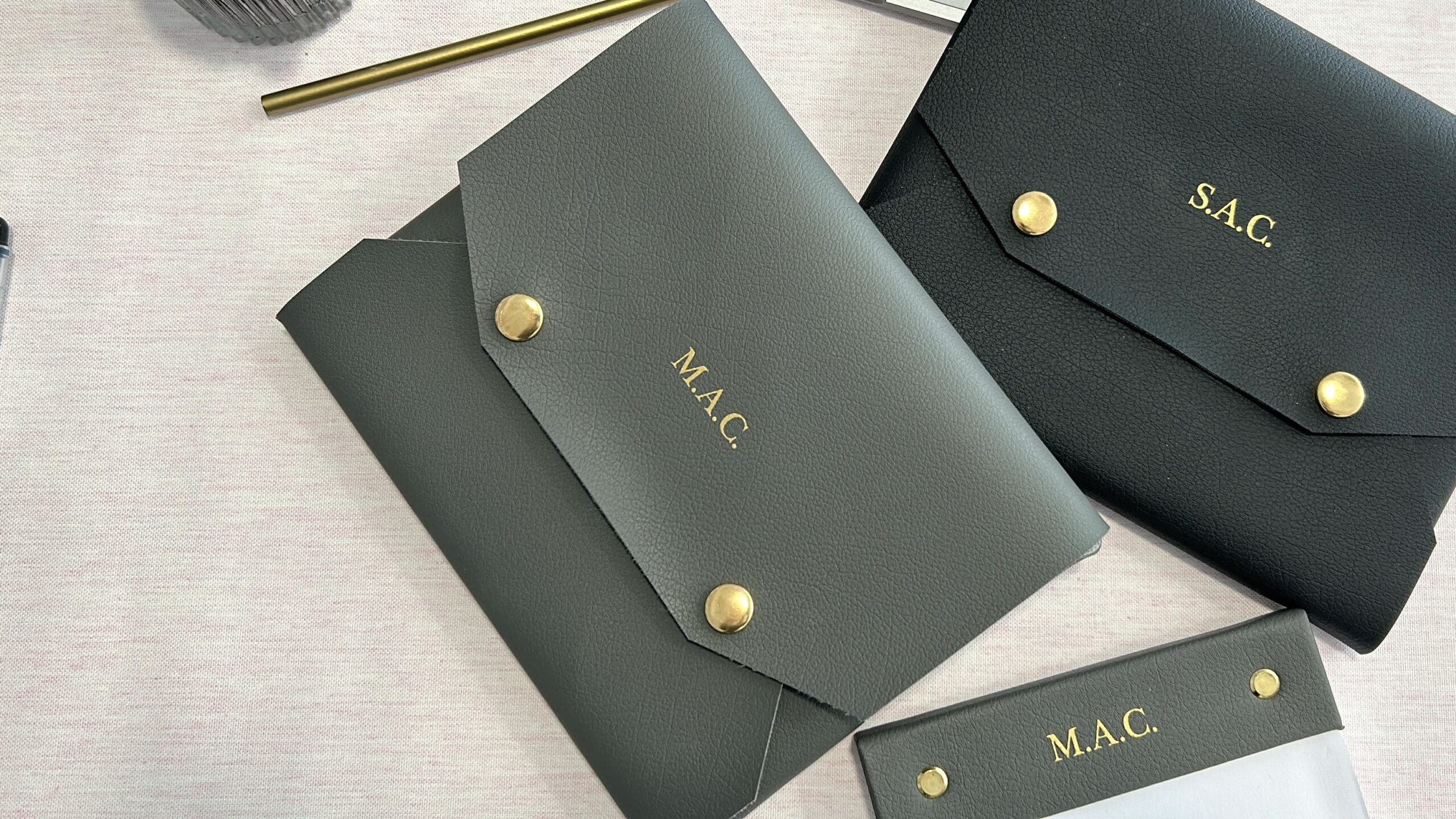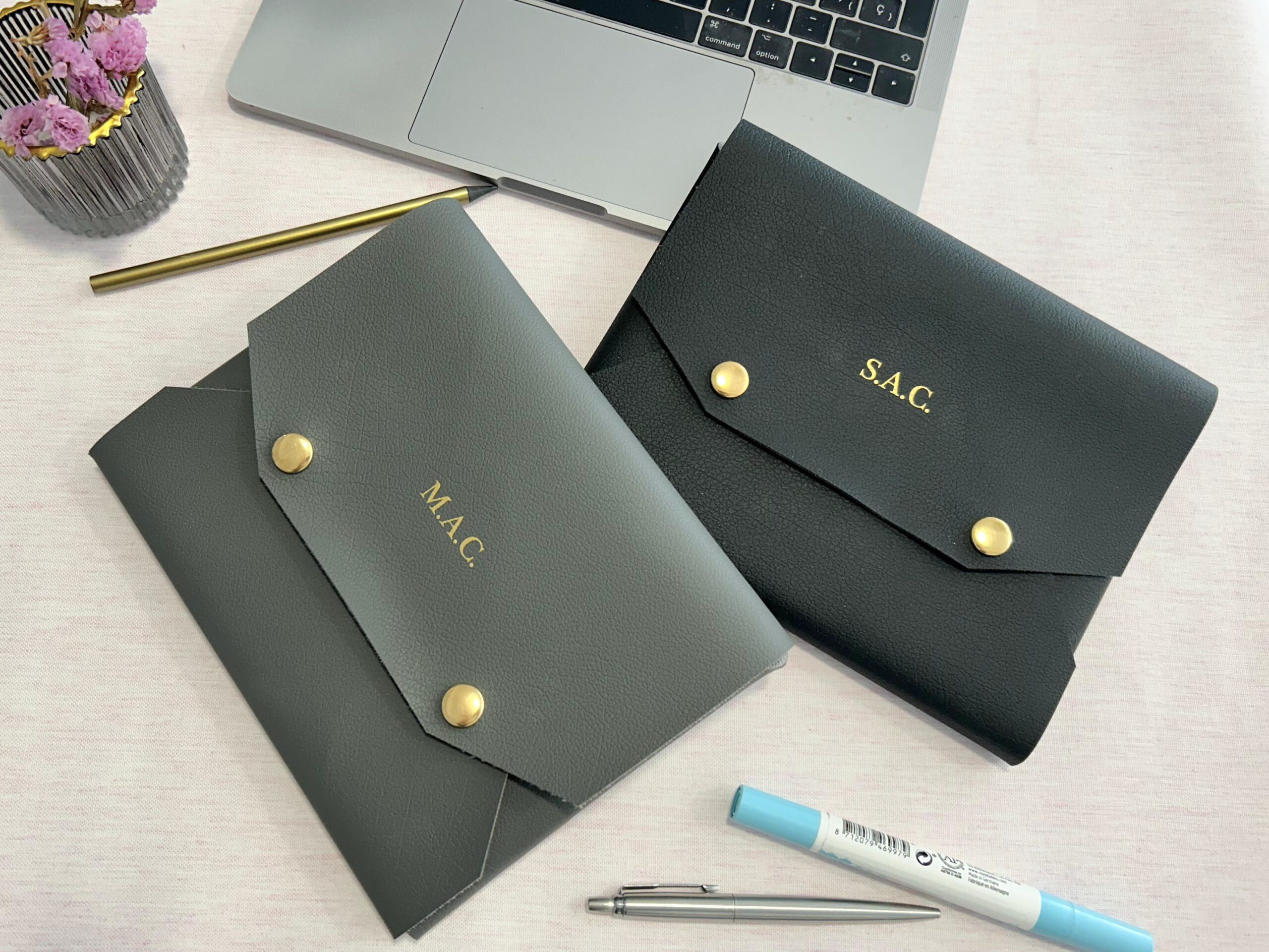 Cartera de cuero vegano, hecha de piel sintética de tamaño 22 x 17,5 cm, personalizada con tu nombre o iniciales en dorado haciendo juego con los dos cierres automáticos. Hecha de forma artesanal, aquí en nuestro taller.