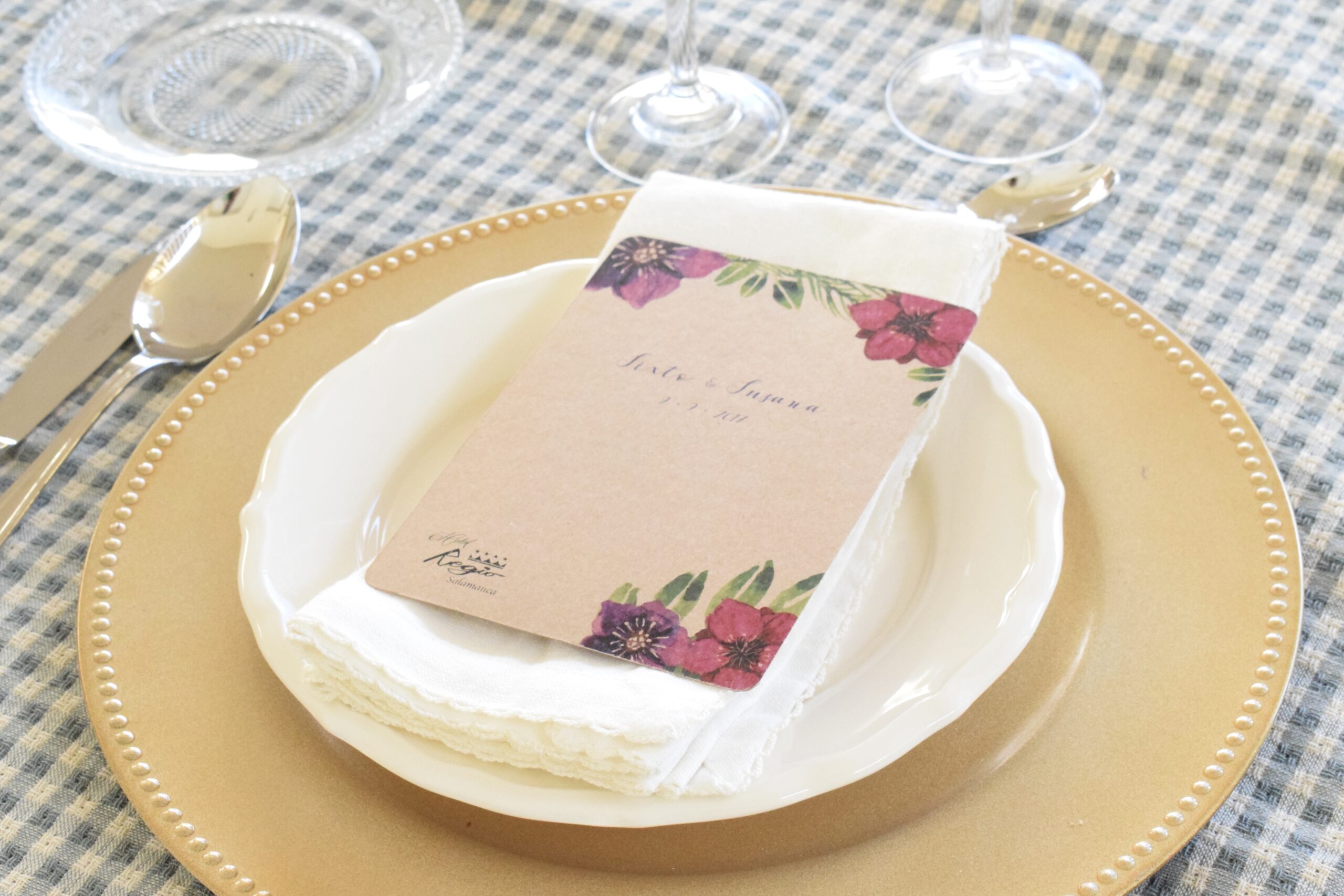 Minuta realizada en papel kraft 300gr y tamaño 108×145 mm, personalizada con vuestros nombres, fecha del enlace y el menú escogido, impreso en la parte trasera de la minuta.