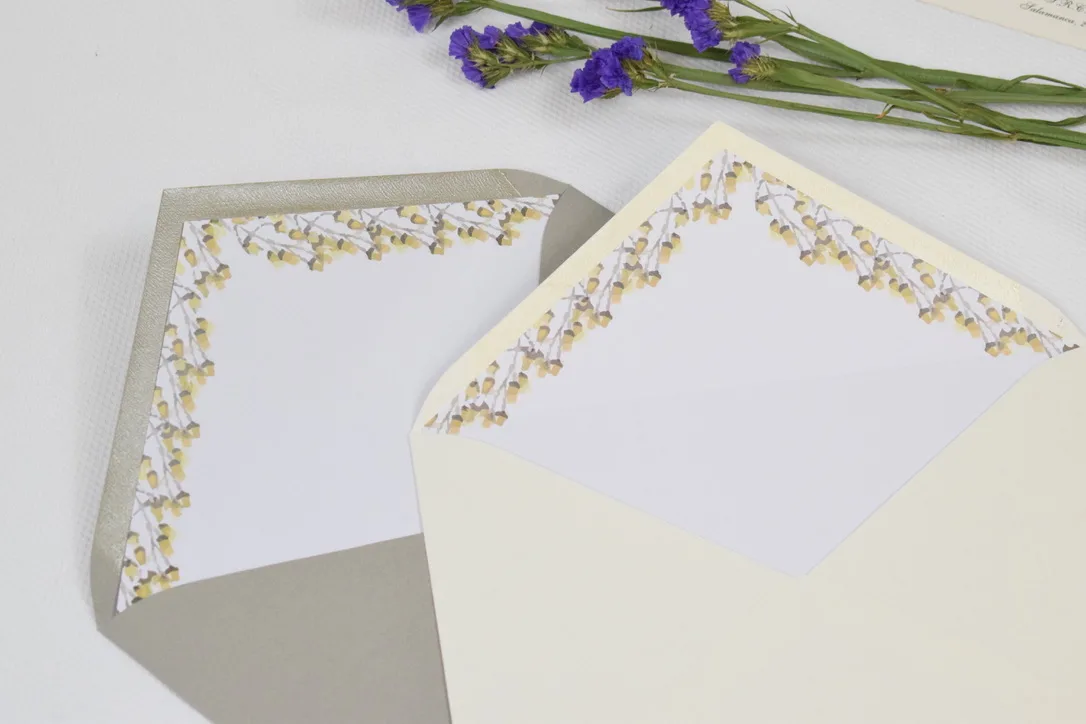 Sobre forrado realizado en papel de 160gr con alto contenido en fibras naturales y con solapa de pico. Se vende con el forro ya montado, listo para meter tu preciosa invitación de boda y empezarlas a repartir!