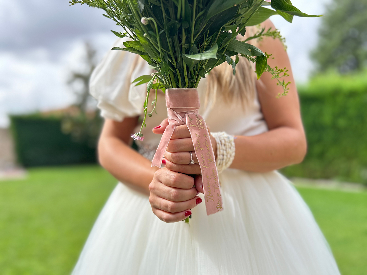 La cinta para el ramo se puede personalizar con los nombres de los novios, las iniciales o la frase que quieras en vinilo metalizado de color oro o plata.
