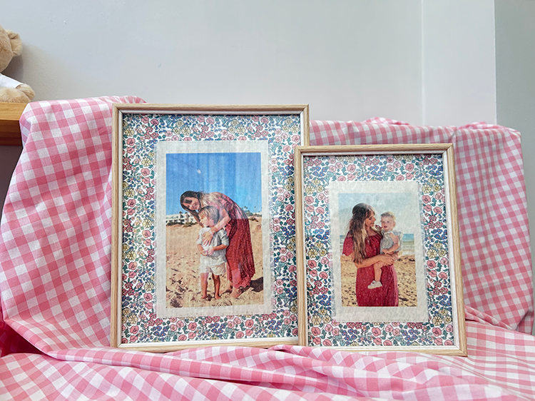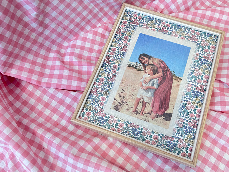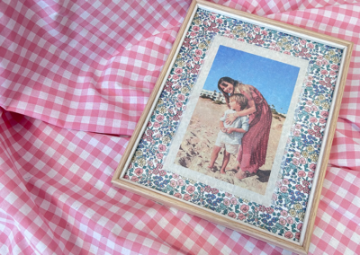 La foto que más te guste impresa en tela beige, con bordes deshilachados y enmarcada en un marco de madera natural con fondo entelado de flores.